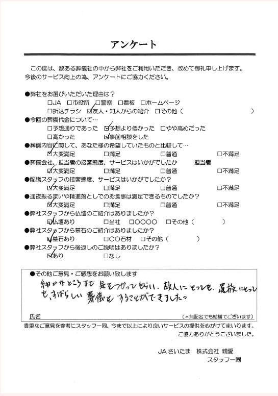 親愛で葬儀を行った方から頂いたありがたい感謝のお言葉をご紹介いたします。